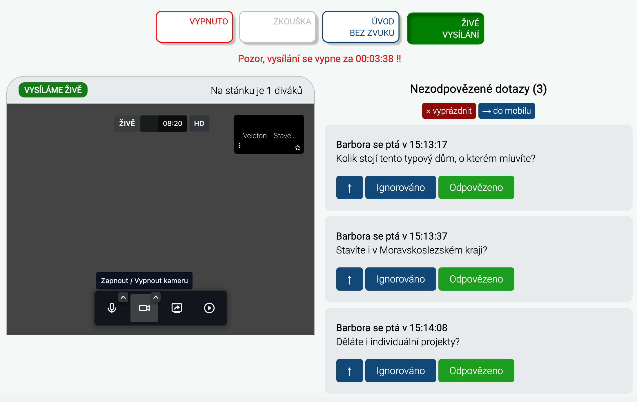 Všechny dotazy budou archivované u správce vašeho stánku. O žádný nepřijdete. Kliknutím na výše uvedená tlačítka se pouze dočasně skryje ve studiu, aby se mohly načíst další dotazy. Ve studiu zůstávají dotazy viditelné ještě 1 hodinu po ukončení vysílání, poté se skryjí všechny.