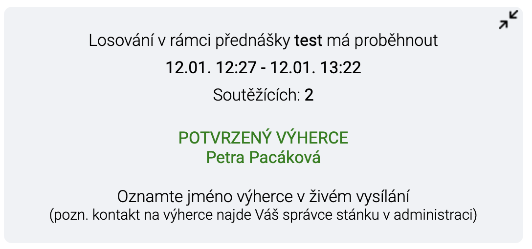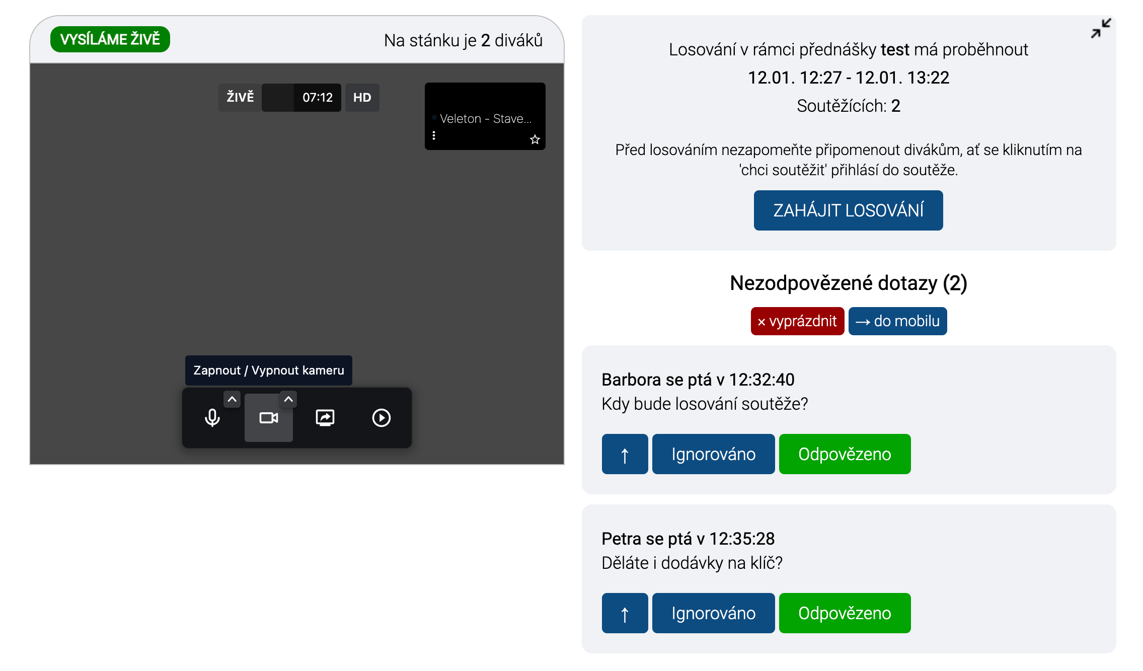 V případě, že se jedná o soutěžní přednášku, zobrazí se vpravo vedle obrazovky studia pole losování. Uvidíte také informaci, kolik je přihlášených soutěžících.