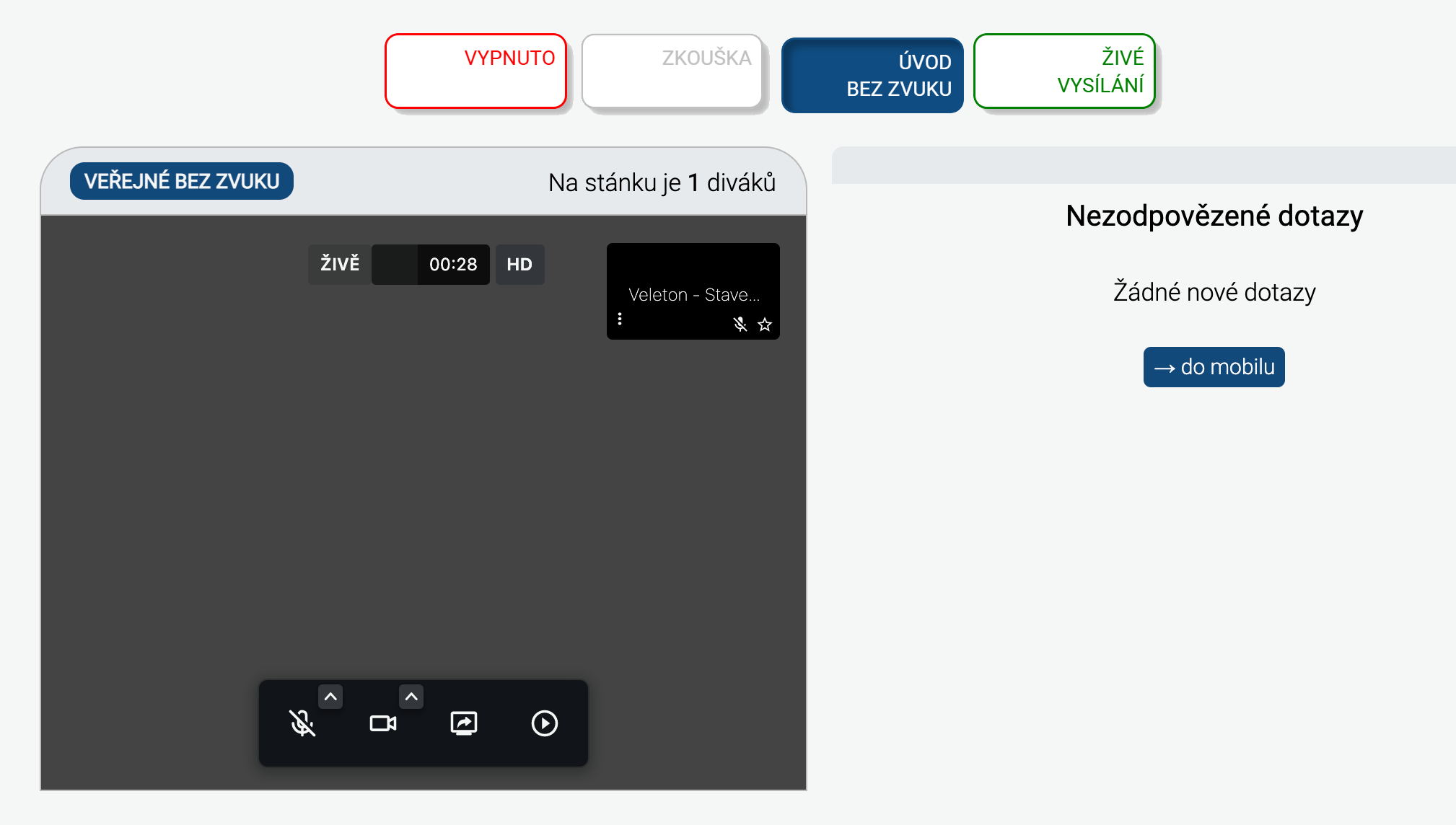 Na straně vysílajícího je systém řešen technologií JITSI a je nastavený na integrovanou kameru a integrovaný mikrofon. Stav zapnutí a vypnutí kamery či mikrofonu se řídí automaticky podle toho, v jaké fázi vysílání se nacházíme (příprava, vysílání, ...)